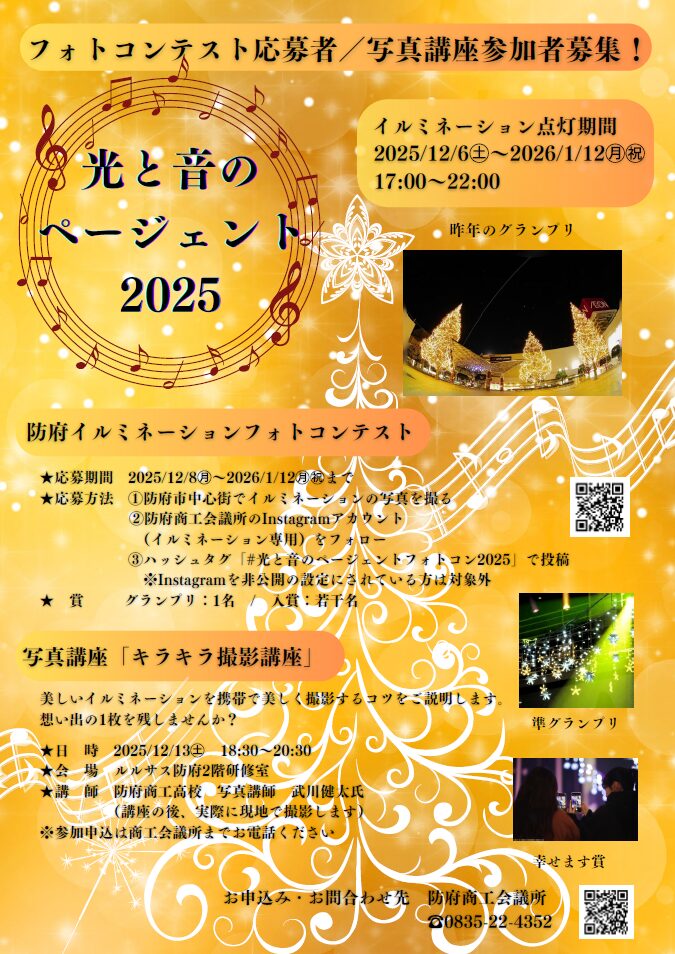 防府イルミネーションフォトコンテストが実施されます。2025年の応募期間は12月8日(月)から2026年1月12日(月・祝)までです。応募方法などは防府商工会議所HPをチェック!