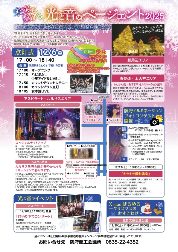 光と音のページェントは防府市内5つのエリア(駅周辺エリア、表参道・上天神エリア、アスピラート・ルルサスエリア)をライトアップするイベントです。
