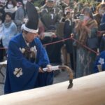 神事では、長さ約4.5m、直径約40cmの檜(ひのき)の丸太に棟梁(とうりょう)が釿(ちょうな)を「えーーーいっ」と打ち込み、木の魂を鎮めると共に今年一年の工事の安全を祈ります。