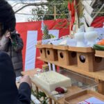 針供養祭典は、防府天満宮 針塚前にて行われる神事で、折れたり曲がったりして使えなくなった古い針を柔らかいお豆腐やこんにゃくに刺して休めます。「針(道具)」への感謝の気持ちを示す美しい習わしです。