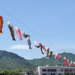 上流にて「こいながし」という川の中にこいのぼりを泳がせる行事も平行して開催されています。空を泳ぐ鯉と川を泳ぐ鯉、こどもの日はぜひ2つのこいのぼりを見に行ってみてください!